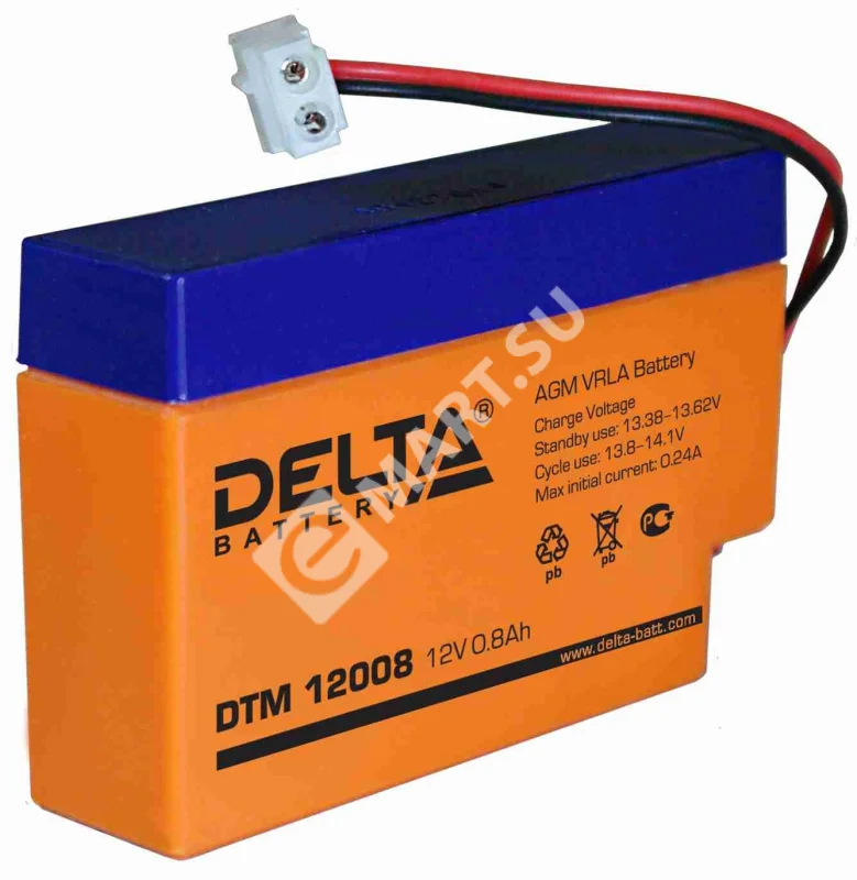 Герметизированный VRLA cвинцово-кислотный аккумулятор Delta DTM 12008 напряжением 12В и емкостью 0.8Ач изготовлен по технологии AGM (с микропористым заполнителем, пропитанным электролитом). Корпус изготовлен из негорючего ABS пластика. Срок службы аккумулятора достигает 6 лет. Аккумулятор предназначен для работы в режиме постоянного подзаряда (буферный режим) или в режиме разряд-заряд (циклический режим). Обладает низким внутренним сопротивлением и саморазрядом.