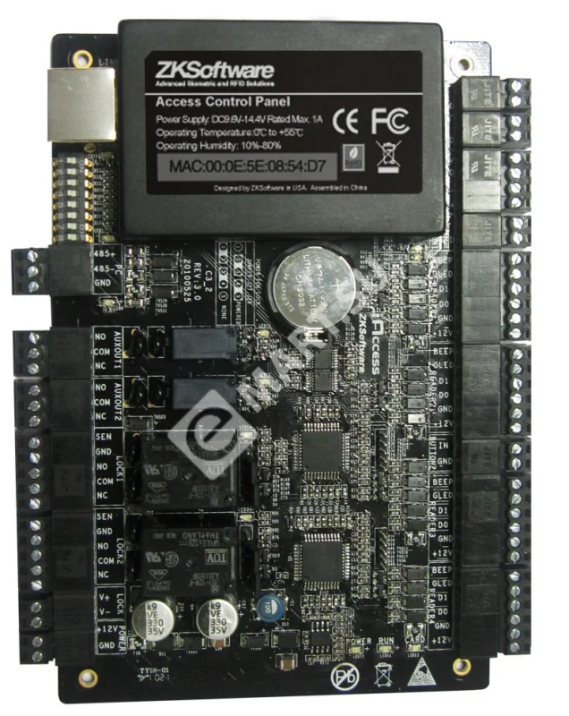 TCP/IP, RS485 Сетевой контроллер на 1 дверь. Память 30000 карт, 100000 событий. Порты считывателя: 2/4 (Wiegand 26/34, пин-панель (клавиатура) 8 бит). Web-сервер, режим мультикарт, режим первой главной карты, проход под принуждением, слот под SD-карту, доп.1 управляемое реле с программированием логических последовательностей. 0° +55°С, питание 9.6V-14.4V ПО ZKAccess3.5 в комплекте.