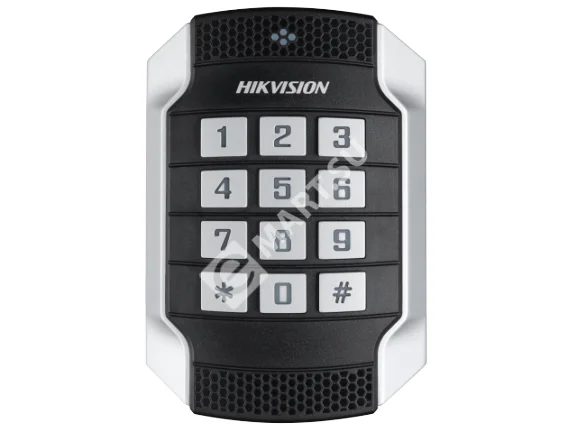 Считыватель карт Mifare Hikvision DS-K1104MK поставляется в вандалостойком (IK10) корпусе, защищенном от влаги и пыли по стандарту IP64, что в совокупности с широким диапазоном рабочих температур -40 °C… +70 °C позволяет применять устройство на улице вне зависимости от времени года. Дистанция считывания — 30–50 мм, рабочая частота — 13.56 МГц. Модель построена на 32-битном процессоре 1 ГГц с DIP переключателем, укомплектована механической клавиатурой на 12 клавиш, LED индикатором (питание, статус соединения, итог идентификации), встроенным бипером, тампером. Предусмотрена функция самодиагностики и устранения ошибок посредством отката до состояния, предшествующего обновлению. Интерфейсы: Wiegand 26/34, RS-485. Питание — DC 12 В, рабочий ток — максимум 0.5 А. При максимальных нагрузках считыватель потребляет не более 6 Вт. Габариты — 1187623 мм, вес — 520 г. Сертификация — CE, FCC. Тип монтажа — накладной.