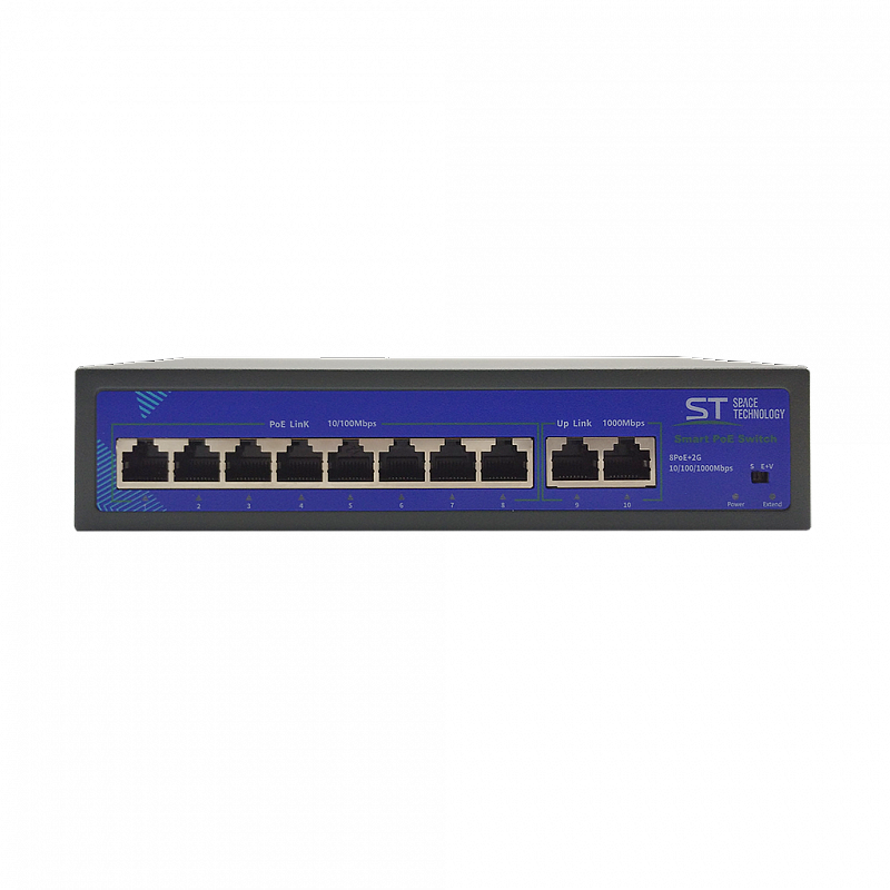 Space Technology ST-S88POE(2G/120W/A) - Источник питания Switch POE 8-ми портовый для обеспечения проводных сетей напряжением 48В. Защита от КЗ. Защита от КЗ. Extend 250м., PoE порты: 8 х (10/100 Мбит/с). UpLink порты: 2 х (10/100/1000 Мбит/с).