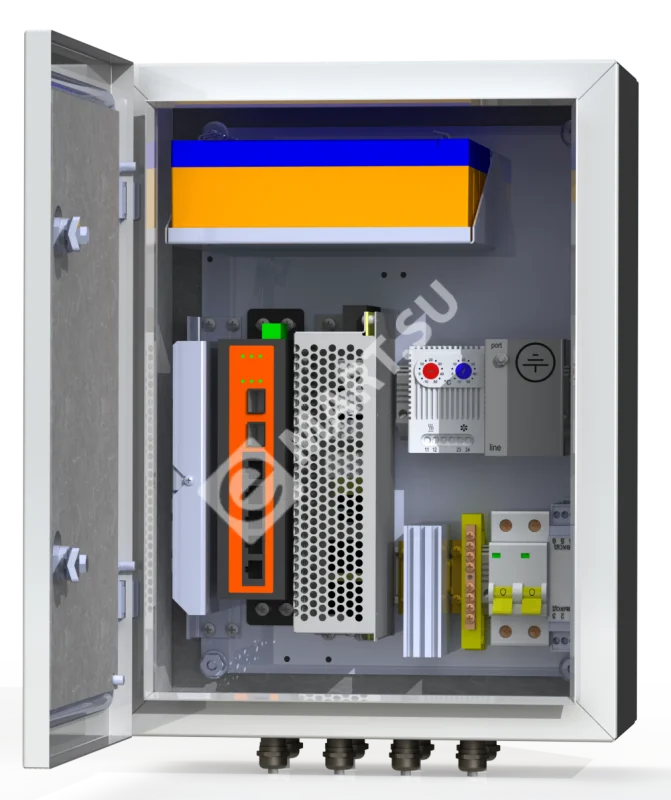 Двухполюсный защитный автомат 6А - 1 шт. Обогреватель 50Вт - 1 шт. Сдвоенный термостат - 1 шт. Блок бесперебойного питания 155Вт -1 шт. Аккумулятор 12В, 2,2А/ч - 4 шт. Промышленный управляемый коммутатор 4*PoE 802.3 af/at (бюджет 140 Вт), 2*SFP, 1*console port - 1 шт. Оптический кросс 4 порта SC/SM - 1 шт. Гермовводы 4*PG9, 4*PG13,5 -1 комплект.