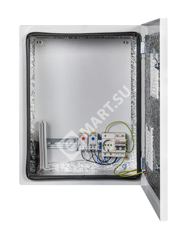 утеплитель из порилекса, замок 2 шт,ключ 1 шт, монтажная плата 1шт, гермовводы 2 шт (MG-25), розетка 1 шт, автоматический выключатель, 6А 1шт, клемма для подключения оборудования 2 шт, клемма заземления 1 шт, термореле 1шт, реле предстарта 1 шт, вентиляционная решётка с фильтром 2 шт, нагреватель мощностью 75 Вт 1шт.