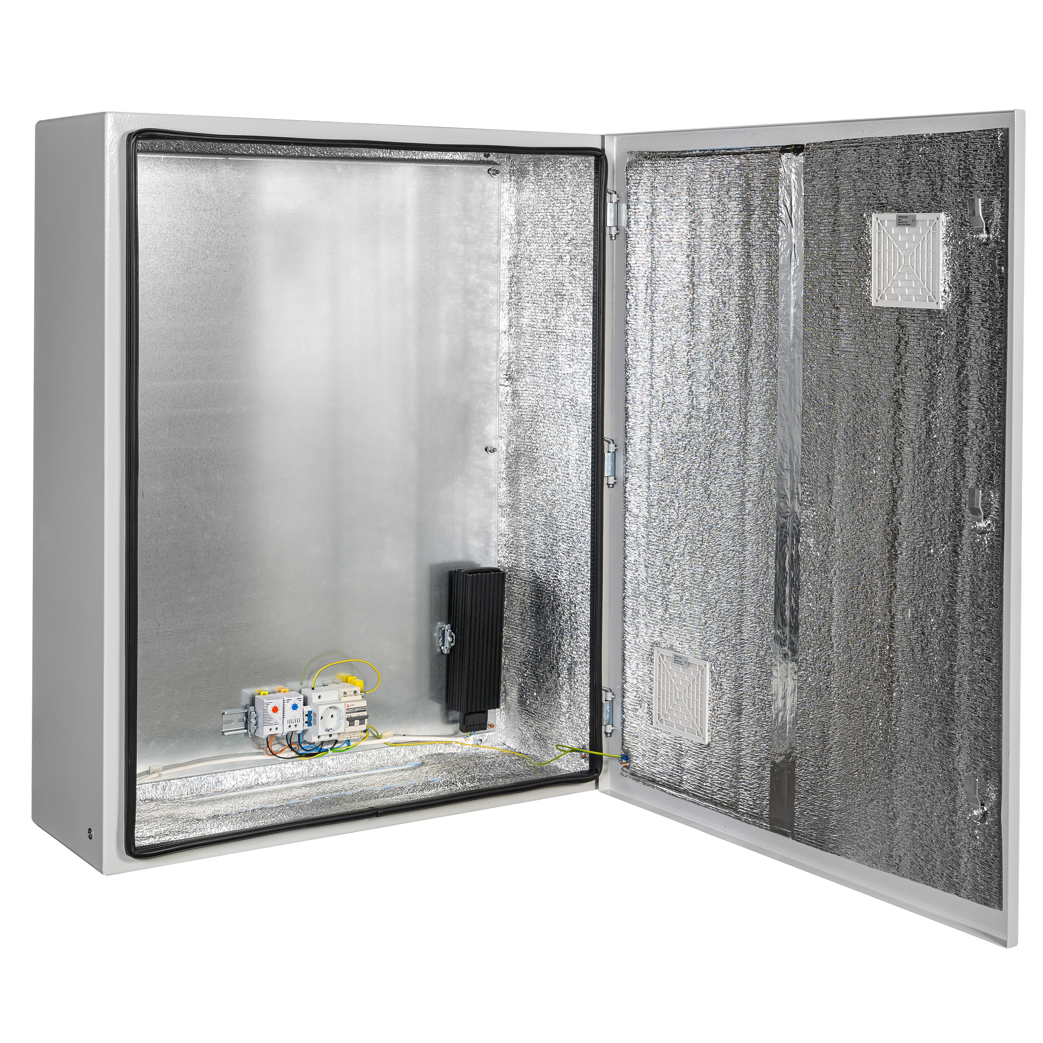 утеплитель из порилекса, замок 2 шт, ключ 1 шт, монтажная плата 1шт, гермовводы 5 шт (MG-25), розетка 1 шт, автоматический выключатель, 6А 1шт, клемма для подключения оборудования 2 шт, клемма заземления 1 шт, термореле 1шт, реле предстарта 1 шт, вентиляционная решётка с фильтром 2 шт, нагреватель мощностью 150 Вт 2 шт.