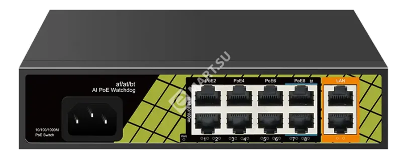 Коммутатор 8x100Мбит/с PoE порта + 2x1000Мбит/с порта Uplink PoE коммутатор 8x100 Мбит/с PoE портов (6 портов 802.3af/at, максимальная мощность PoE 30Вт на порт, 2 порта 802.3af/at/bt, максимальная мощность PoE 60Вт на порт) + 2x1000 Мбит/с порта Uplink, общий бюджет PoE 120 Вт, автоматический PoE watchdog, встроенный блок питания, грозозащита и защита от статического электричества, от -30°С до +60°С.