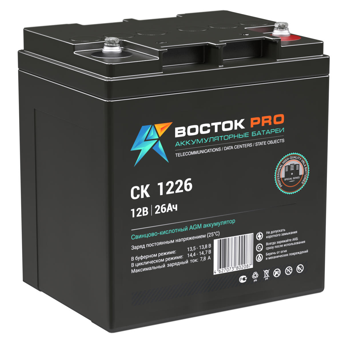 Свинцово-кислотные аккумуляторы ВОСТОК серии CK предназначены для использования в системах бесперебойного питания, резервного энергоснабжения, автономных энергосистемах. Изготовлены по AGM технологии (электролит, абсорбированный в стекловолоконном сепараторе), являются герметизированными и необслуживаемыми, со сроком службы в буферном режиме 10 лет (от 5 до 26 Ач – 5 лет). Обладают высокими разрядными и эксплуатационными характеристиками благодаря использованию в составе электролита и намазной пасты специальных добавок, препятствующих коррозии и замедляющих процесс старения.