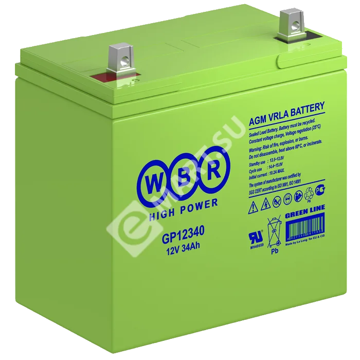 Аккумулятор WBR GP12340 - герметизированная, выполненная по технологии AGM, аккумуляторная батарея общего применения со сроком службы до 8 лет в буферном режиме или 260 циклов заряда-разряда в циклическом режиме при 100% разряде. Эта высокоэффективная, перезаряжаемая батарея, не требующая обслуживания в течение всего срока службы.