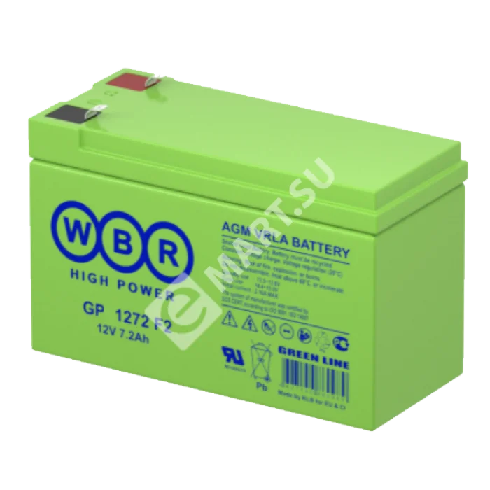 Аккумулятор WBR GP1272 F2 - герметизированная, выполненная по технологии AGM, батарея общего применения со сроком службы до 8 лет в буферном режиме или 260 циклов заряда-разряда в циклическом режиме при 100% разряде. Эта высокоэффективная, перезаряжаемая батареи, не требующая обслуживания в течение всего срока службы.