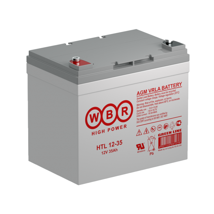 Аккумуляторы WBR серии HTL12-35 - герметизированные, выполненные по технологии AGM, свинцово-кислотные аккумуляторные батареи общего применения с увеличенным до 15 лет сроком службы в буферном режиме при 20 °С. Эти высокоэффективные перезаряжаемые батареи не требуют обслуживания в течение всего срока службы. Основные области применения: источники бесперебойного питания (UPS), оборудование систем телекоммуникации и электроэнергетики, аварийное освещение, освещение пешеходных переходов и светофоры на солнечных батареях, системы «умного дома» для жарких регионов, в которых оборудование работает при высоких температурах.