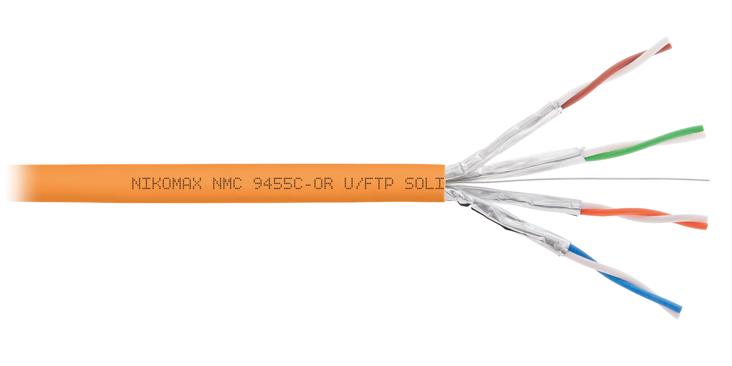 Кабель NIKOMAX U/FTP 4 пары, Кат.6a (Класс Eа), тест по ISO/IEC, 500МГц, одножильный, BC (чистая медь), 23AWG (0,58мм), полимерный материал нг(А)-HF, внутренний, оранжевый, 500м - гарантия: 15 лет / 25 лет системная