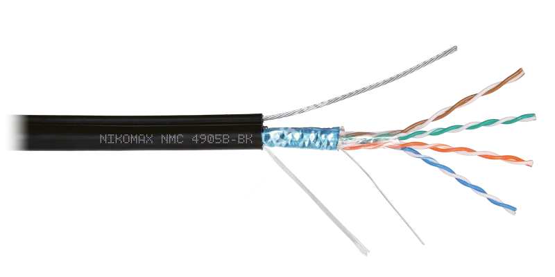 Кабель NIKOMAX F/UTP 4 пары, Кат.5e (Класс D), тест по ISO/IEC, 100МГц, одножильный, BC (чистая медь), 24AWG (0,51мм), полиэтилен, внешний, с многожильным тросом (1,25мм), черный, 500м - гарантия: 3 года