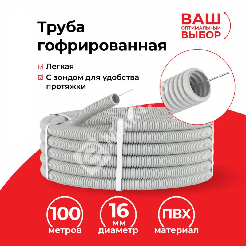 Материал: самозатухающий ПВХ Металлический зонд Наличие металлического зонда (протяжки) по всей длине гофрированной трубы облегчает протяжку кабеля после монтажа. Степень з