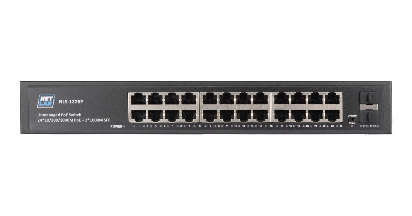 Коммутатор NETLAN, неуправляемый, 24*10/100/1000Мбит/с PoE (af/at), 2*10/100/1000Мбит/с SFP, DC52V/6.1A, PoE бюджет 320W